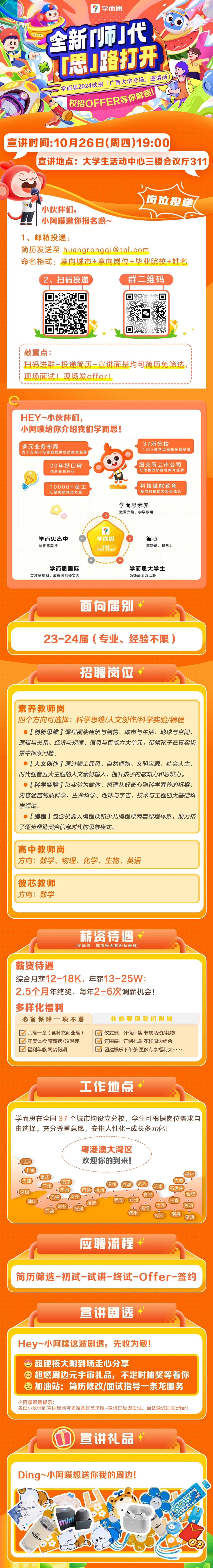 #上市企业学而思2024秋招宣讲会-广西大学专场Hey伙伴们~我们来啦!!10月26日 (周四)19:00大学生活动中心三楼会议厅(311)敲重点:无需笔试、宣讲过后即现场面试,面试通过即现场发offer!专业经验不限、教资应聘时不做硬性要求!【关于公司】学而思总部位于北京,是综合性教育企业,同时也是教育培训集团。公司于2010年在美国纽约证券交易所上市,是中国教培行业的头部企业。【在招岗位】素养教师、高中教师、彼芯教练、管培生【薪资待遇】综合月薪12-18k,年薪13-25w;2.5个月年终奖,每年2-6次调薪机会!🥳【福利文化】1、基本福利:六险一金、年度体检、带薪病假/公益假、福利年假、司龄假期2、花式福利:评优评奖、节庆活动、定制礼物、花样周边、团建娱乐、下午茶等等你来解锁!【岗位关键词】1、全周期完善培训体系2、导师一对一帮带3、专业与管理通道双向发展【一键投递】https://jinshuju.net/f/egziRT投递简历-宣讲面基-简历面筛选现场面试- 现场offer发放!