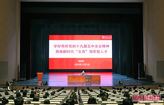 12月1日下午,校党委书记刘正东以《学好用好党的十九届五中全会精神,勇做新时代“五有”领军型人才》为题,在汇学堂为我校师生讲授了一堂精彩的形势与政策课。电气工程学院组织750多名新生、全体辅导员在第六教学楼五个分会场观看报告会直播,学院主要领导、师生代表在主会场汇学堂参加报告会。
