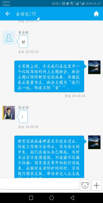 电自163班: 我们班根据学院的号召通知文件,制定了电自163班防疫主题教育活动方案,分项说明学习内容和学习形式,明确各项内容的学习步骤和学习方法。其次,由同学借助网络资源,自主学习文件里包含的学习内容。随后,组织全班同学在易班开展了相关的主题班会,同学们在班会上抒发自己对于疫情的看法。最后,我们组织同学们分别前往易班微社区和话题贴进行发言和点赞。以下图片是电自163班学习情况: