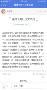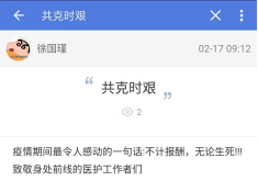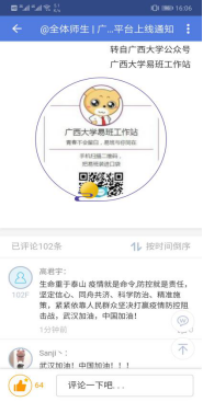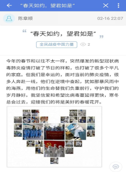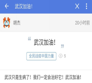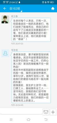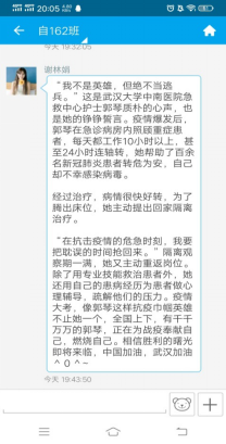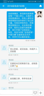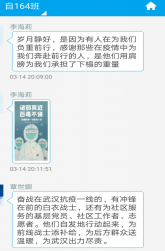 自164班:我们班在易班中开设“网上班级”,通过易班组织网上主题班会、网上组织生活,讨论观后感、学习心得和个人思考。开展“一句话”“一个人”“一个举动”“一个场景”“一个视频”“一个群体”等交流活动,上传和分享疫情防控中的先进典型、动人故事和感人语录。同学们踊跃参与,积极讨论,分享抗疫中的感人故事。如:覃同学接着分享了如下图片,并感慨道:“奋战在武汉抗疫一线的,有冲锋在前的白衣战士,还有为社区服务的基层党员、社区工作者、志愿者。他们自发地行动起来,为前线战士添补给,为后方群众送温暖,为武汉出力尽责。” 通过这次主题教育活动,同学们明白了作为一名大学生,防止新冠肺炎疫情向校园扩散,每个人都有义不容辞的责任。疫情当前,虽然很多同学因为毕业论文、答辩、实习工作等一系列问题,迫切想要开学,但是在学校发出通知前一定不能提前返校,这不仅是对个人的不负责,也是对大家生命安全的漠视。