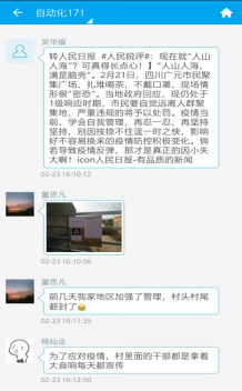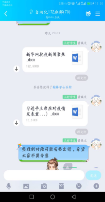 自171班:我们一起战“疫”,形成中国力量,有你我有他。本次学习是通过易班上传和分享疫情防控中的先进典型、动人故事和感人语录,创建班级群进行相关看法以及观点的交流学习。一、线上讨论交流。由班委做好表率,率先起头,引起话题,然后同学们参与讨论与交流,同学们积极表现,时常在群里面上传自己所关注疫情的相关动态,引发同学们讨论与学习,同学们积极发言,并在易班内部的微社区全民战疫板块积极发表自己想法。关注疫情的同时也进一步提高了自我对疫情防控的重要认识。