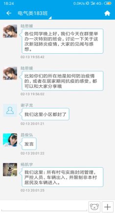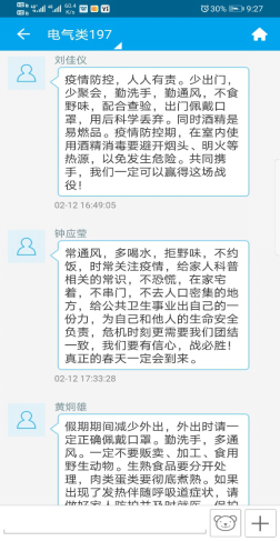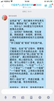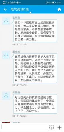 电气197班:同学们通过在易班等社交平台表达了对于此次学习的思想感悟以及互相积极鼓励学习先进知识,交流了抗疫的小知识与实时的疫情防控信息。做到第一自己坚守阵地自我保护不为抗疫添乱,其次积极为朋友和家人传播正确的抗疫斗争思想,做到力所能及地为中国抗疫添一份自己的力量