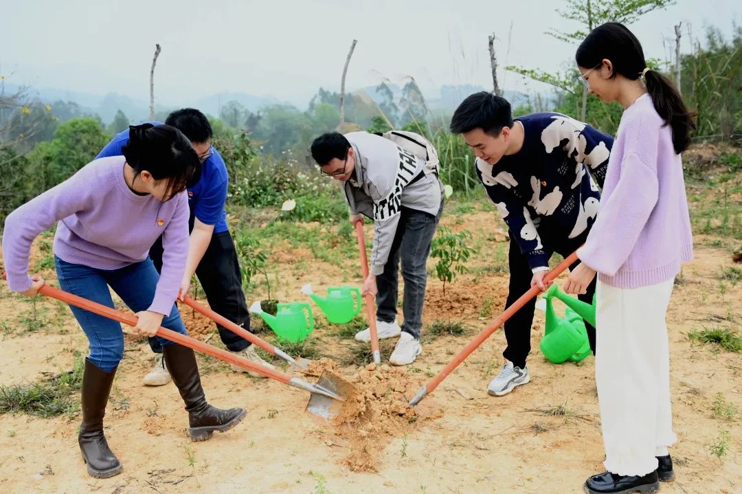 天色初晴,伴随着凉爽的春风,植树活动环节的现场呈现井然有序的景象。在支部书记韦俞妃的带领下,支部成员们以党小组为单位,扛苗散苗、挥锹铲土、定点挖坑、覆土压实、提桶浇灌,大家分工有序、密切配合,并为各自小组的树苗挂上了专属铭牌,经过近一个小时的努力栽培,一排排芒果树苗整齐挺立。