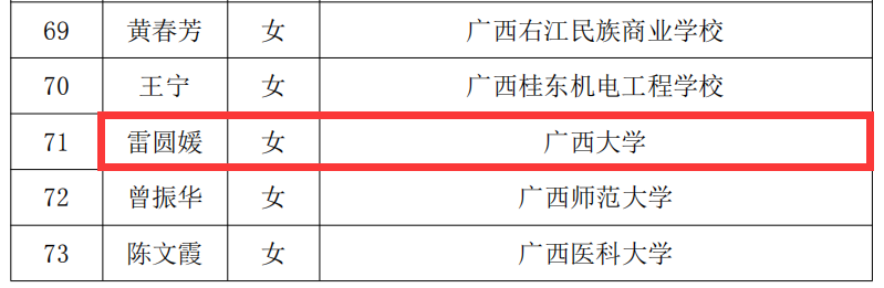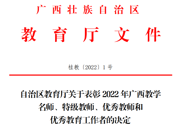 近日,为表彰全区广大教师和教育工作者在教育事业中做出的积极贡献,广西壮族自治区教育厅开展了2022年广西教学名师、特级教师、优秀教师和优秀教育工作者的评选活动,我院雷圆媛老师荣获“自治区优秀教育工作者”荣誉称号。