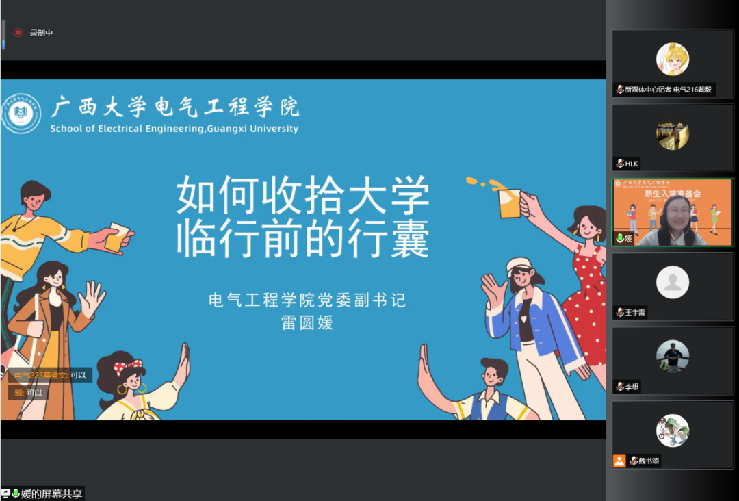 为帮助即将步入大学的2022级本科新生尽快适应大学生活,8月24日,我院召开以“收拾大学临行前的行囊——从物品到精神专题”为主题的新生入学准备会,会议采用线上视频会议的形式开展。学院党委副书记雷圆媛、副院长胡立坤出席会议并发表讲话。新生班主任、年级辅导员、教务员、学生干部代表、班助和全体本科新生参加此次会议。会议由学院团委书记石建有主持。