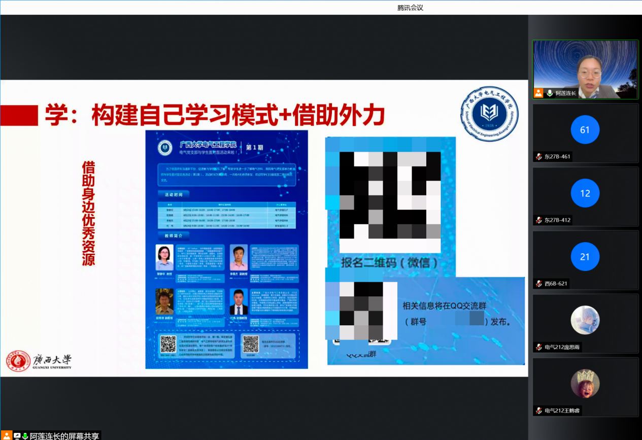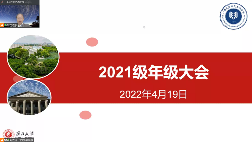 4月19日下午,广西大学电气工程学院以视频会议的方式召开2021级本科生年级大会。学院党委副书记雷圆媛出席会议并讲话,年级大会由团委副书记蒋冬连主讲,2021级全体本科生参加会议。