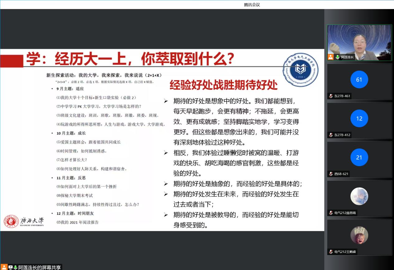 在会议的交流环节,蒋冬连老师就同学们所提出的“第三学期的教学安排”、“课程的重修”等问题进行逐一解答。最后,蒋老师希望2021级全体同学早日定好目标,积极践行“创新创造、奋勇争先、全面一流”的广西大学“双一流”精神,在接下来的学习生活中挑战自我,突破自我。