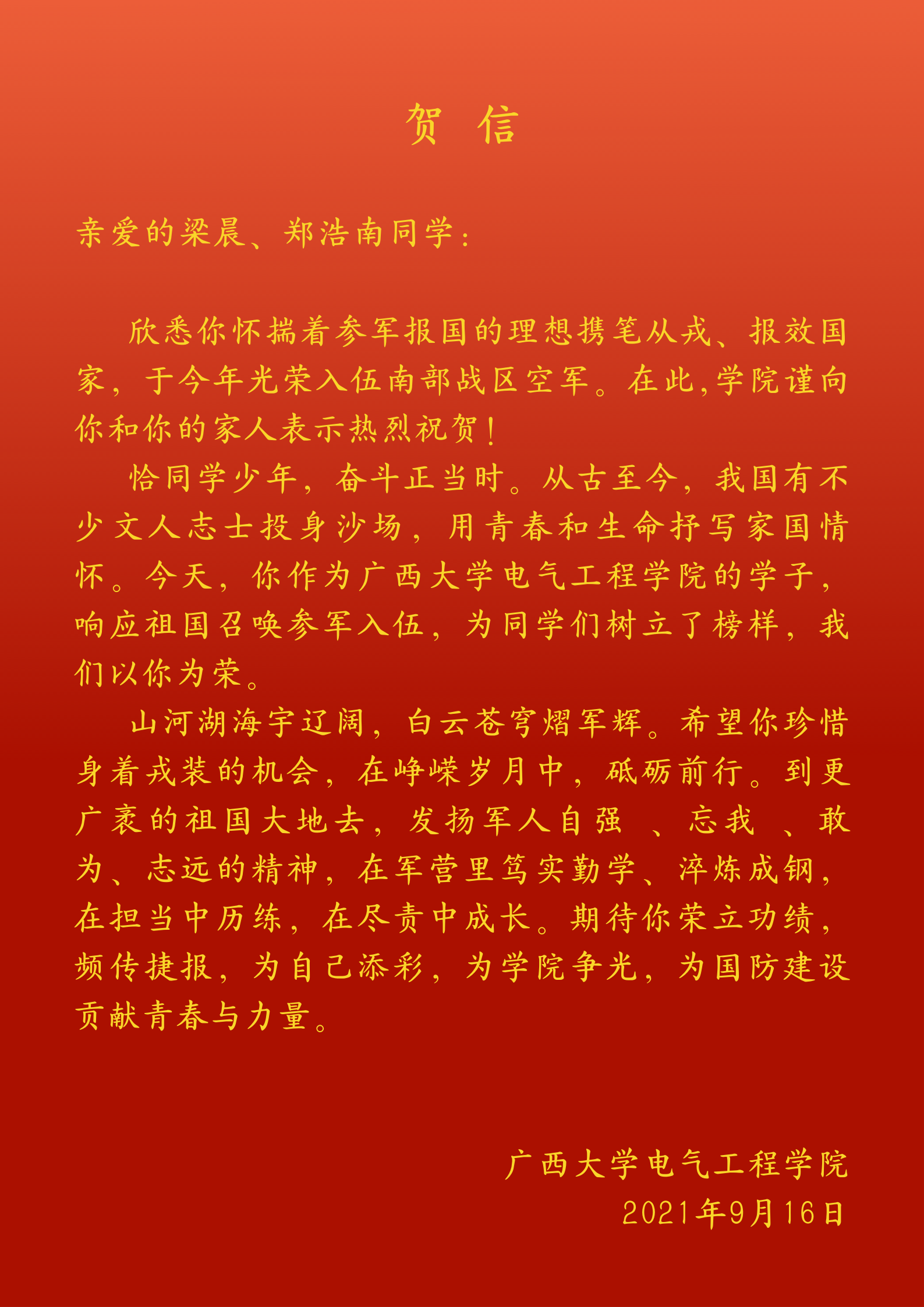 2021年秋季学期,广西大学电气工程学院学生梁晨同学和郑浩南同学响应祖国召唤参军入伍。其中,梁晨入伍南部战区空军,郑浩南入伍战略支援部队,为表示祝贺,学院给两位同学发了贺信。