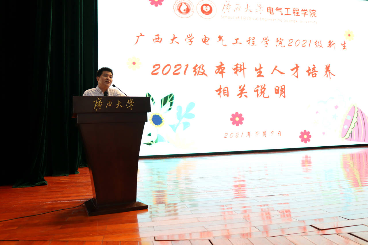 9月9日下午,广西大学电气工程学院2021级新生迎新典礼、开学第一课、入党启发教育、本科生人才培养相关说明系列迎新活动相继在大礼堂成功举行。电气工程学院院长双丰、人工智能研究院院长武新章等领导及教师代表、新生班主任、全体辅导员出席活动,453名本科新生和312名研究生新生参加活动。迎新典礼由院党委副书记梁志坚主持。