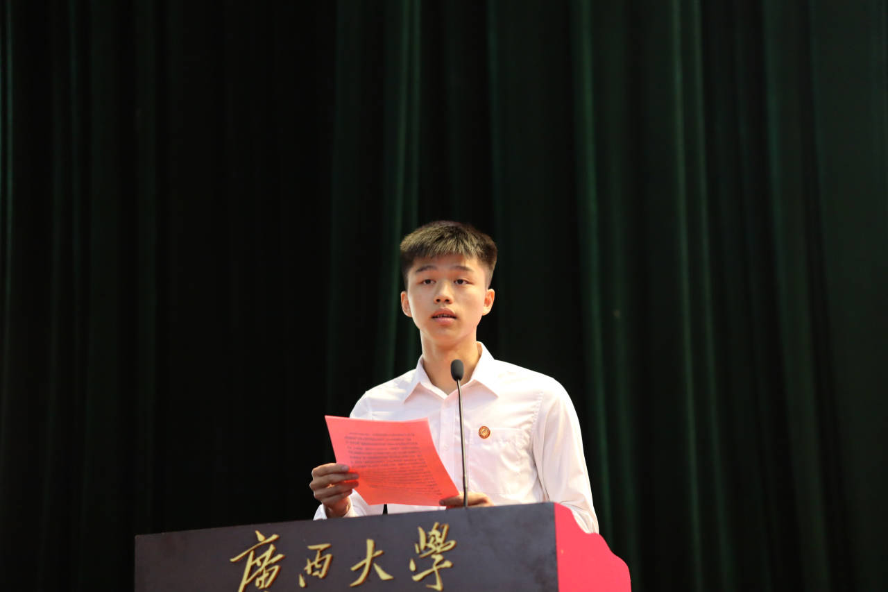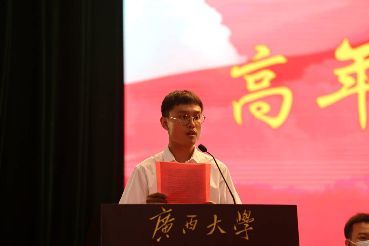 研究生团委副书记谭思源和学生会主席蒙军分别作为高年级代表做了发言,他们代表全体高年级学生对新生的到来表示欢迎,并表示生逢盛世,使命在肩,当不负盛世。新生代表康子瑞表示,身为西大人,应当以马君武校长为榜样,以勤恳朴诚,厚学致新的校训立言力行,勇往直前。