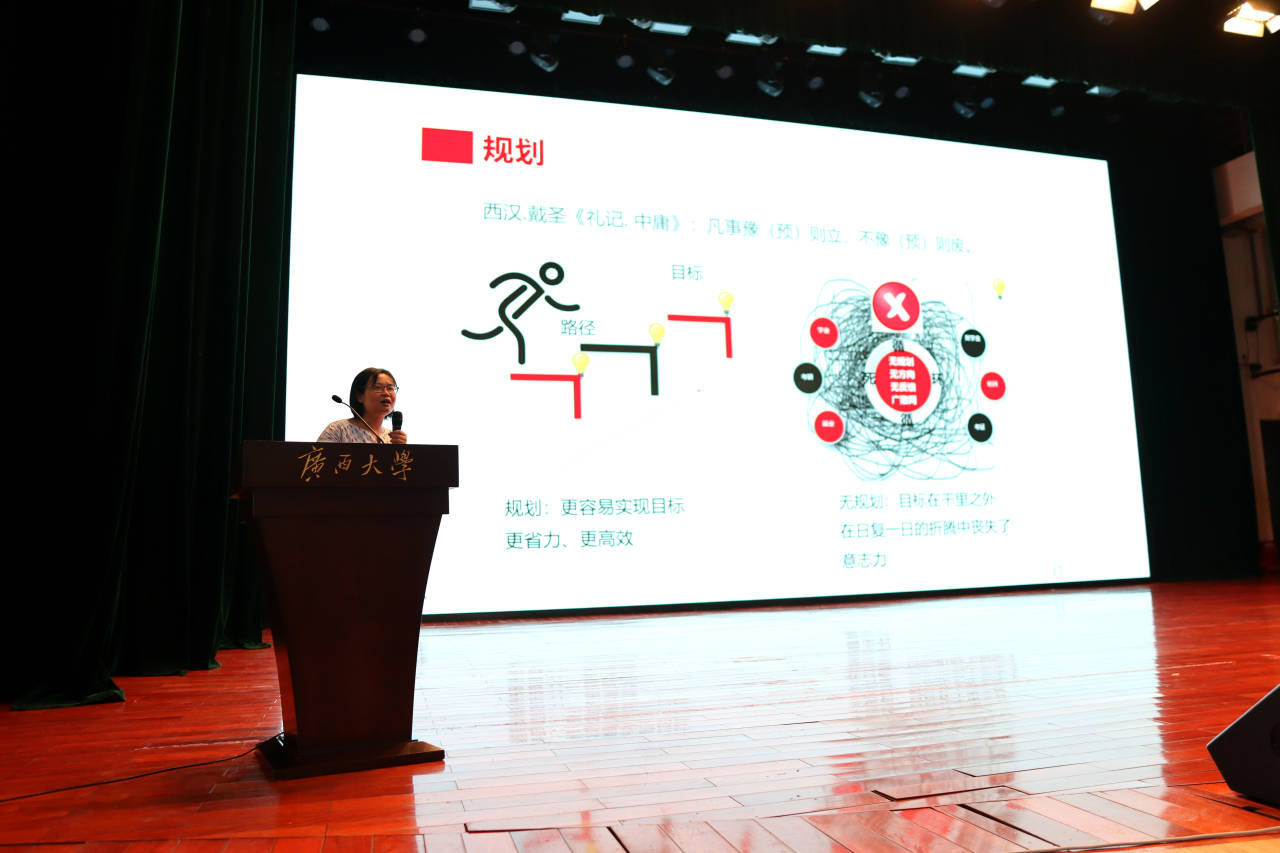 迎新典礼过后,副院长黎静华老师为全体新生讲解了如何才能度过一个美好的大学生活。她结合自身教学经验以及自己的亲身经历,分别从“规划”“行动”“方法”“心态”四个方面向同学进行了深入讲解,并列举出自己身边的典型例子,告诫同学们应时时刻刻把握时光,才能度过一个美好的大学生活。最后,黎老师对新生提出了期盼,希望他们作为新时代的新青年,更应肩负使命,共同努力,用优异的成绩,为广西大学电气学院的发展贡献坚实的力量。
