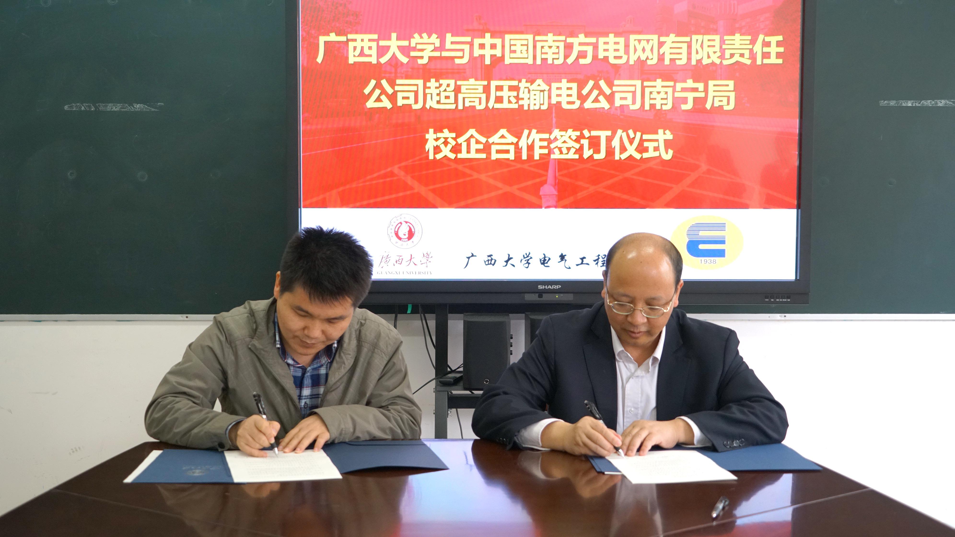 会上,南方电网超高压输电公司南宁局平果实训部总经理、党委副书记朱炳坤首先介绍本次来访的意图,并介绍了实训中心的职责以及目前从事的技术研发与改造项目。学院党委书记梁京章简要介绍了广西大学、电气学院的历史和现状,对分局的来访表示热烈的欢迎和感谢。双方就协议中关于人才培养、技术合作、培训互动等条款开展了深入探讨,认为协议的签订对双方都具有重大意义和作用。最后教学副院长胡立坤代表学院与朱炳坤总经理签订了校企合作协议。