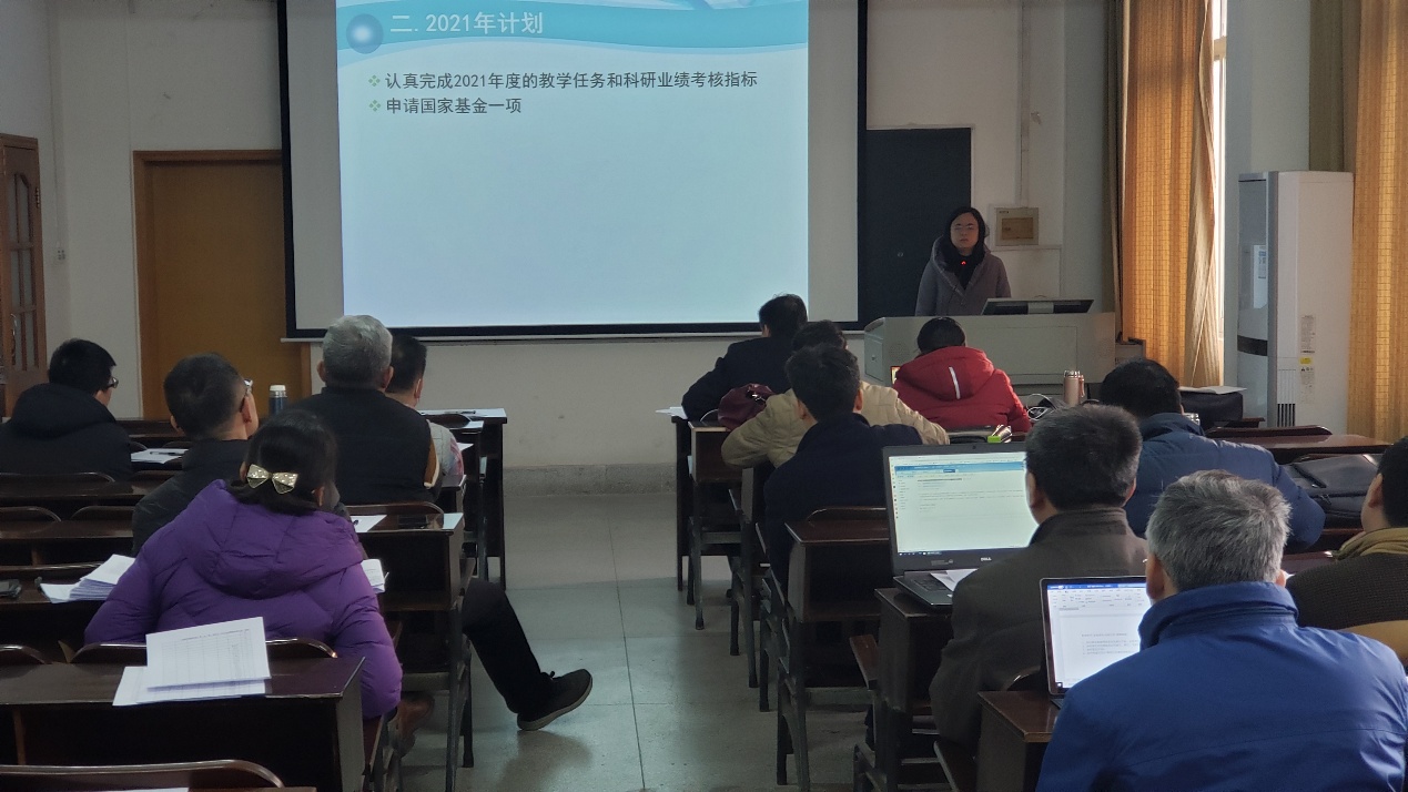 述职以系或教研室为单位分组进行,采用PPT形式现场汇报,教师介绍个人师德师风情况、2020年教学科研工作情况以及2021年教学科研工作计划等,其他教师听取汇报后进行现场评分。学院制定了评分标准,从教学工作量、教学质量(师德师风)、科研工作(教学研究工作)、公共服务四个方面及总体情况进行等级评价。专任教师们按照要求制作了汇报PPT,依序进行了现场述职汇报。