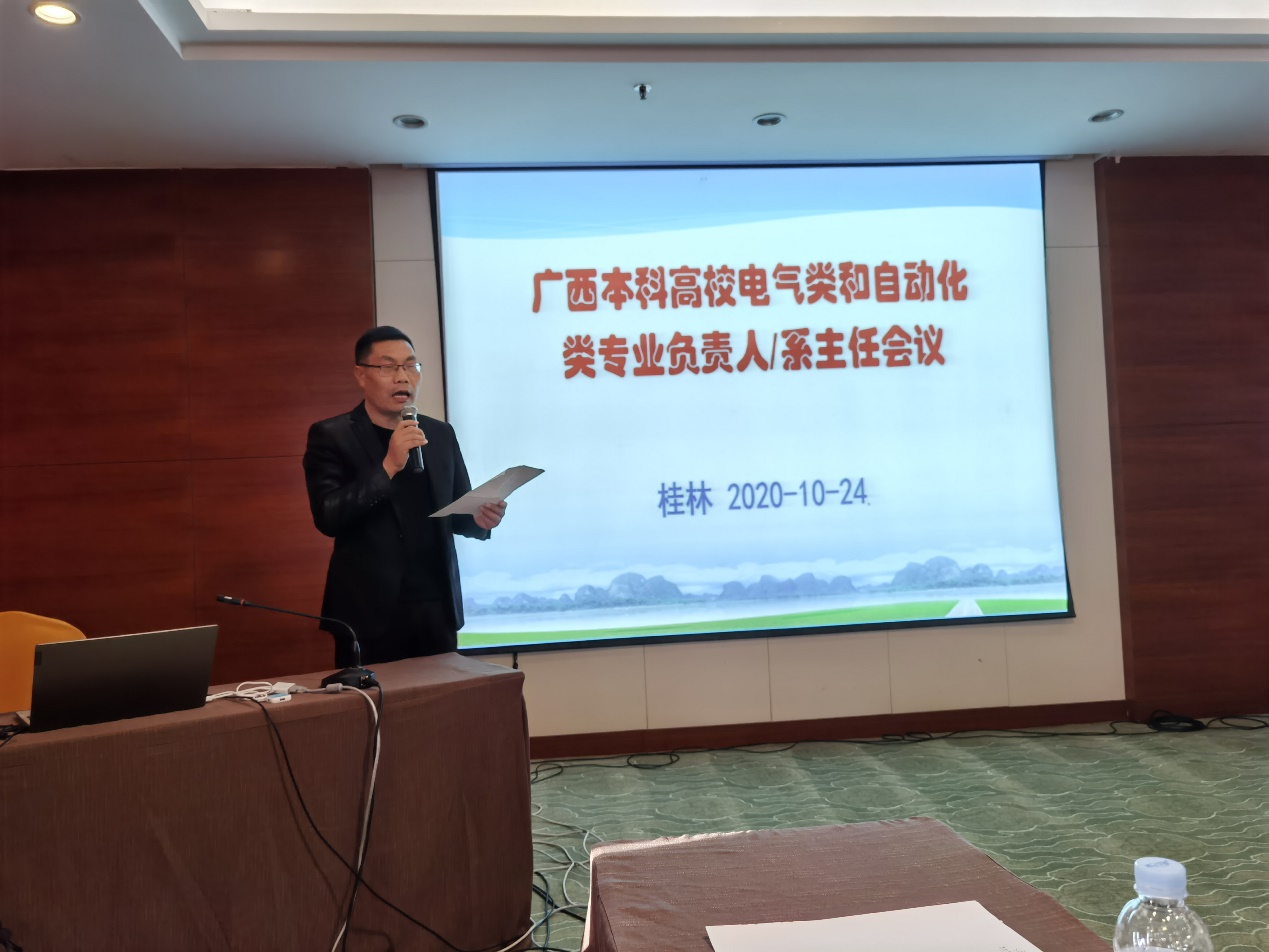 为加强我区各高校电气类和自动类专业的联系,2020年10月24日广西本科高校电气类和自动化类专业负责人/系主任会议在桂林召开,会议由广西本科高校电气工程及自动化类教学指导委员会主办,桂林理工大学机械与控制学院和广西大学电气工程学院承办。会议邀请桂林理工大学教务处副处长致欢迎辞,教指委委员伍锡如教授代表教指委致开幕辞。