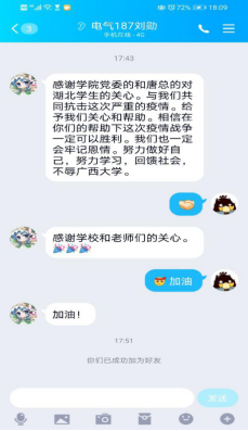 王子潇同学说:“身为湖北的学生我感谢广西大学,感谢电气学院党委的体恤,感谢Tang Family 基金会唐总的大爱,疫情无情,人间有爱!我在湖北省孝感市,也是疫情重灾区,宅家近两个月的时间,我有对疫情的恐惧,也有对生命的敬畏,看见国家倾全国之力救助湖北,我们全家都很感动,我要在今后的研究生学习中精进学业,专注课题,毕业后报效祖国!”