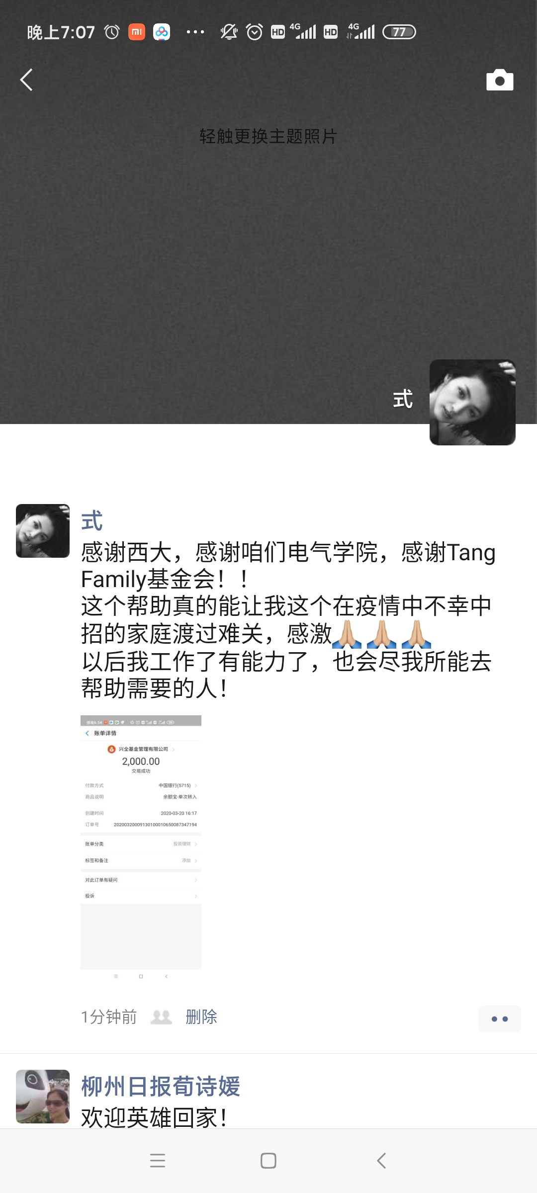 毛洋同学说:“在家宅的这些天,学校又帮我们核对信息,发了两次补助金,是真的有点感动,甚至有点小羞愧。自己感觉没有做过什么却受到了照顾,有点不好意思,非常感谢国家和学校。现在家这边情况也逐渐好转了,怀着感恩的心情向国家,向西大,向Tang Family基金会表示由衷的感谢!我也必定会好好要求自身,好好上进,在以后国家需要我的时候发挥作用。”