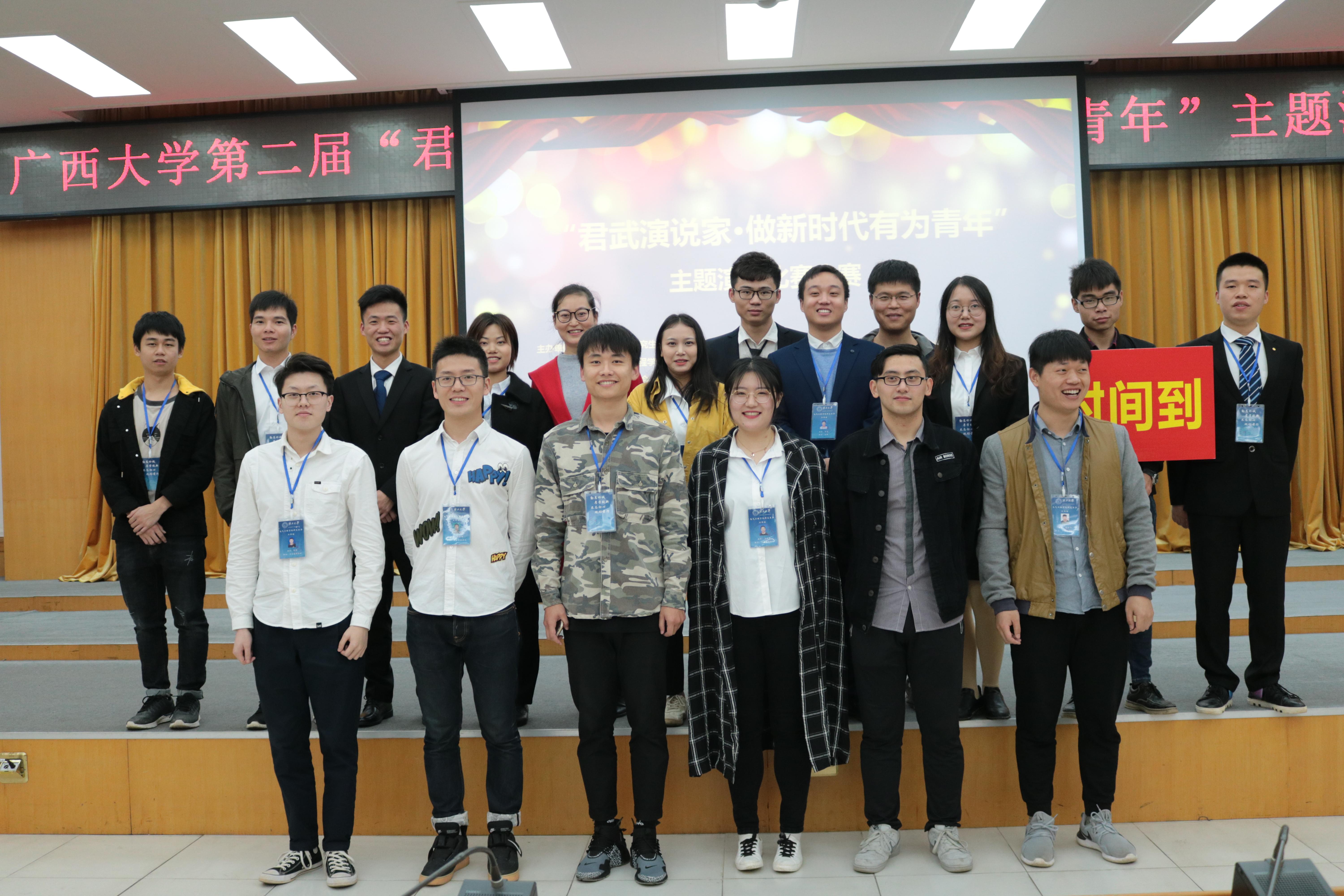 潜心学术,勇攀科研。承办广西大学第二届“君武演说家·做新时代有为青年”主题演讲比赛。选手们以“新时代”和“新青年”为主题,旨在深入学习、全面贯彻习近平新时代中国特色社会主义思想,鼓励当代大学生青年开拓进取、努力奋斗,积极投身新时代中国特色社会主义伟大事业。