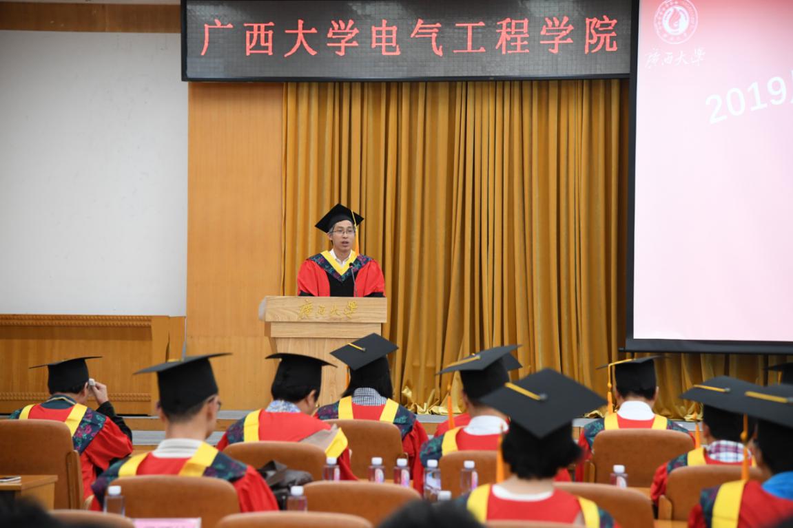 6月16日上午,电气工程学院2019届研究生学位授予仪式在君武楼玉林厅举行,广西大学副校长马少健出席,电气工程学院院长双丰,校研究生工作部副部长刘小玲,电气学院副院长胡立坤、刘辉、黎静华,教研室负责人,研究生导师等一起出席。学位授予仪式由学院党委书记梁京章主持。