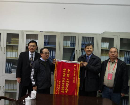 人来到电气工程学院座谈,向学院赠送锦旗:西大根深,五洲花开皆桃李;饮水思源,四海归来母校情。
