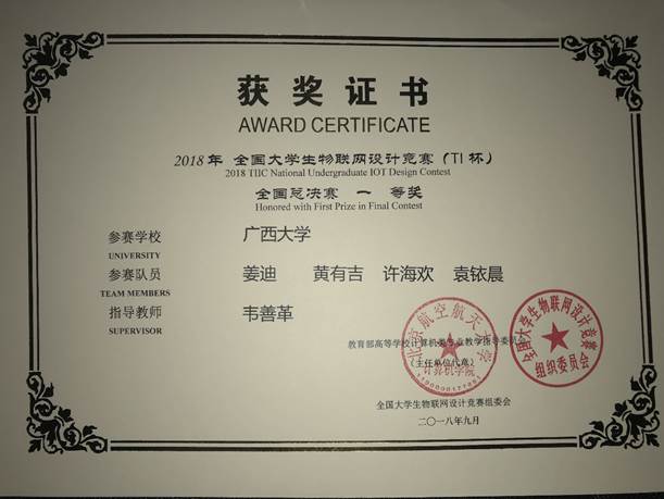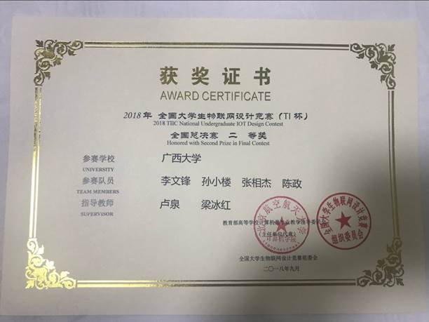 今年8月,我学院有3支学生队伍代表广西大学参加2018年全国大学生物联网设计竞赛(TI杯)的华中及西南分赛区比赛,获赛区特等奖2项(并入围全国总决赛)、赛区二等奖1项。