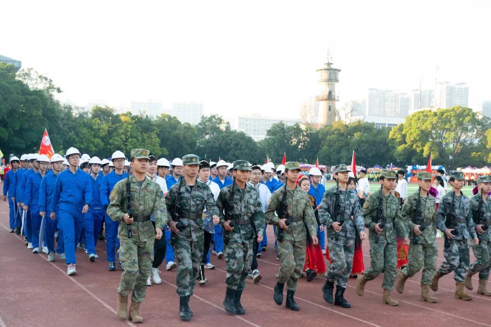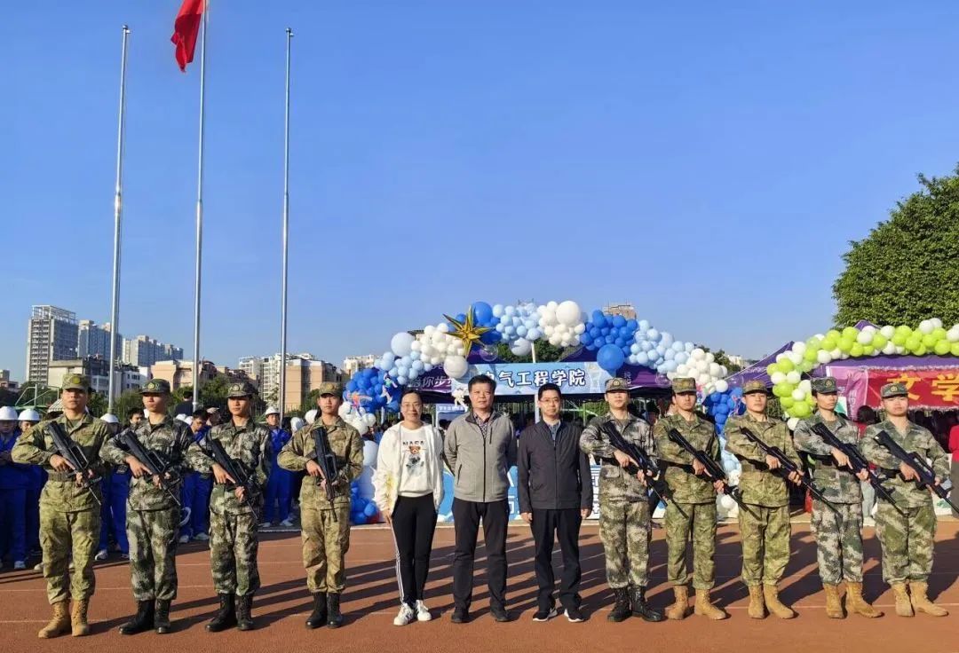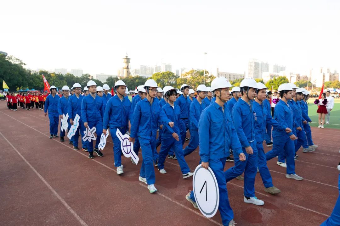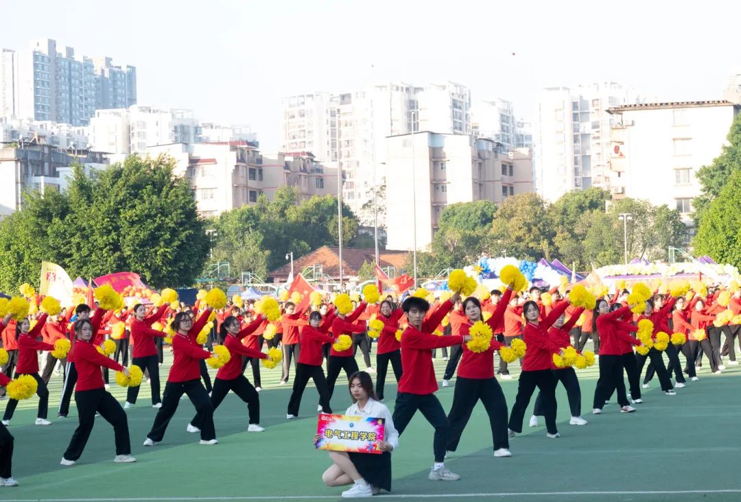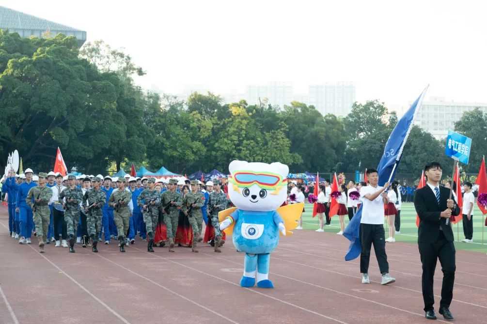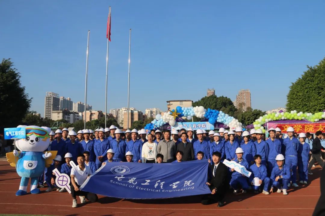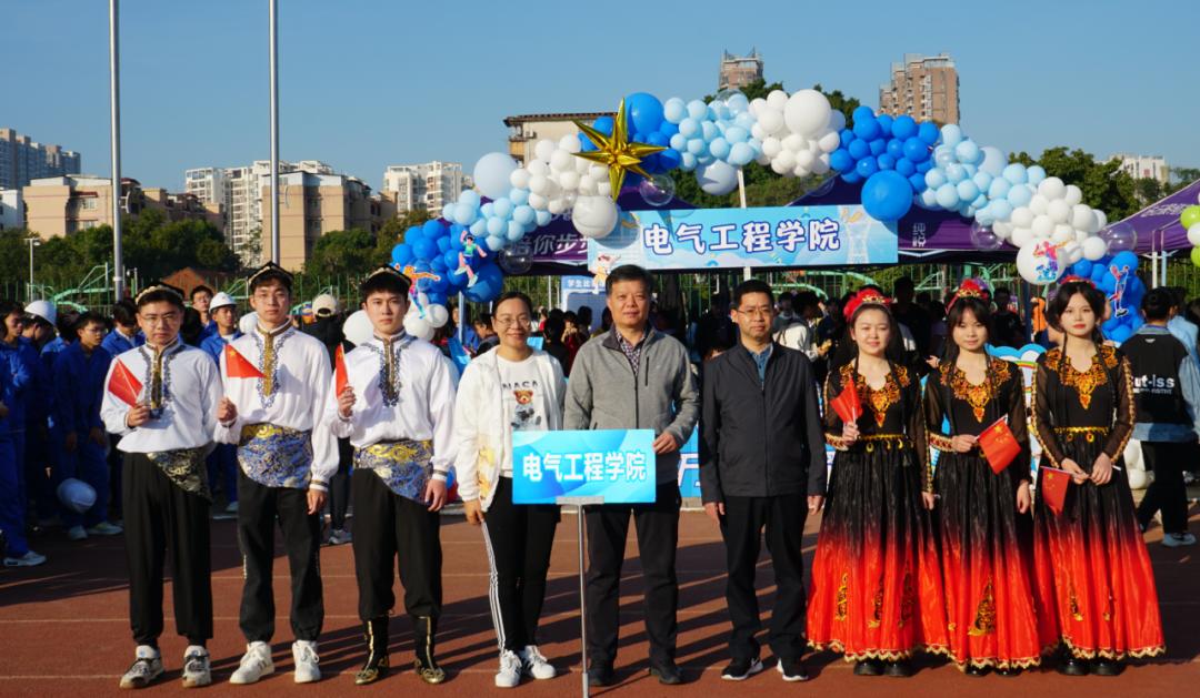 开幕式上,伴随主持人激昂的解说,我院吉祥物电电熊和意气风发的电气学子们阔步走来。他们或身着军装或身着民族服饰和专业特色服装,神采奕奕,步履坚定,志气高扬,展现了电气学子的青春风采和蓬勃朝气。