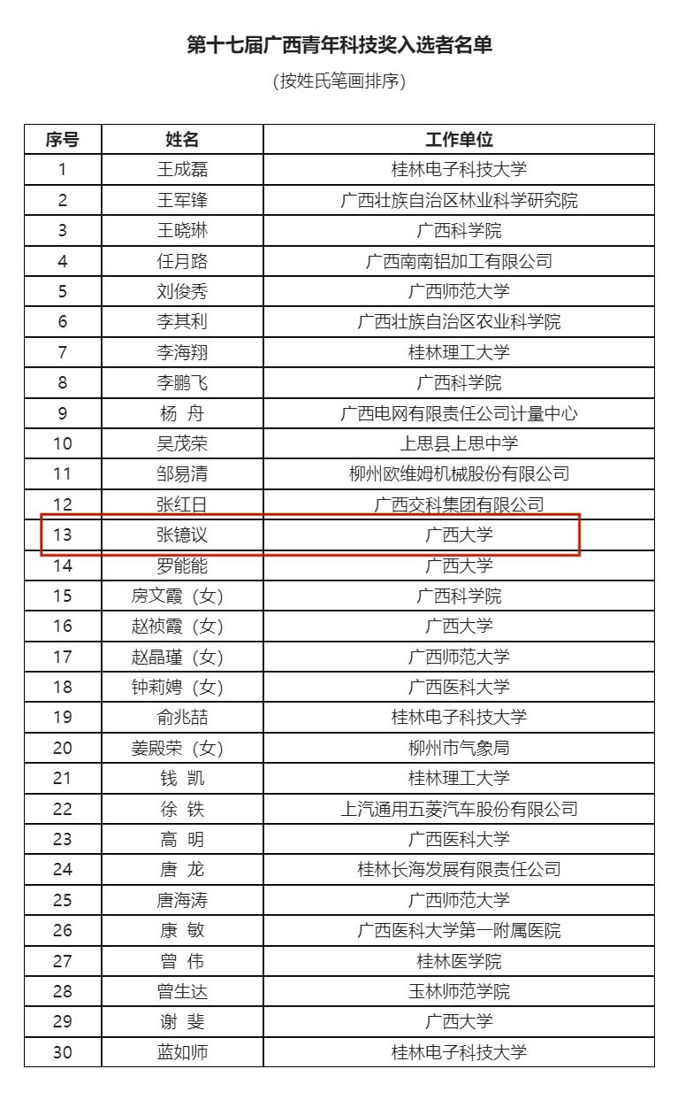 近日,广西壮族自治区科学技术协会第九次代表大会在南宁召开,会上对30名第十七届广西青年科技奖获得者进行了表彰。广西壮族自治区党委书记刘宁,中国科协专职副主席、书记处书记孟庆海等共同为获奖者颁奖。其中,我院副院长张镱议教授获此殊荣。 张镱议教授,电气工程学院副院长,学院高电压与绝缘技术研究领域带头人,主要研究方向为电力装备安全防护与绝缘材料,入选自治区优秀专家和八桂青年学者,主持国家自然科学基金面上项目、广西重点研发计划、广西杰出青年基金等项目。近五年,他发表50余篇SCI论文,授权21项专利,并编写5项国家/电力行业标准。成果支撑其以第一完成人荣获广西技术发明一等奖、日内瓦国际发明展金奖、中国产学研合作创新奖等多项大奖。 据悉,广西青年科技奖评选由自治区党委组织部、自治区人社厅、自治区科协、共青团广西区委共同组织,每两年评选一次,每次授奖不超过30人。本届评选旨在激发广西广大青年科技工作者的创新创造活力,引导他们坚守“四个面向”的原则,积极投身于经济建设和科技创新的主战场,在新发展阶段中精准把握机遇、全面贯彻落实新发展理念、积极融入新发展格局,以实际行动为广西的科技自立自强和高质量发展贡献智慧和力量,建功立业,创新争先。