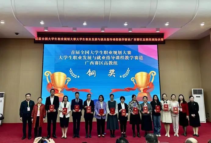 3月16日,首届全国大学生职业规划大赛大学生职业发展与就业指导课程教学赛道广西赛区高教组现场决赛在南宁师范大学举行。我院辅导员蒋冬连老师获铜奖(第十一名)。 蒋冬连老师参加比赛现场图 据悉,首届全国大学生职业规划大赛大学生职业发展与就业指导课程教学赛道广西赛区现场比赛设高教组和职教组。比赛最终成绩由网络评审和现场比赛两部分成绩组成,分别占60%和40%,高教组现场比赛决出金奖3名、银奖6名、铜奖12名。现场总决赛分为课程建设情况汇报、互动答辩、教学或指导情景模拟三个环节。 接下来,学院将以职业规划大赛为契机,努力打造适合学生的职业生涯教育大课堂,引导大学生科学合理规划学业与职业发展,提升职业能力素养,实现高质量就业。 颁奖仪式现场(左六为蒋冬连老师)