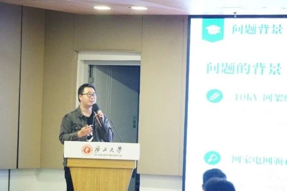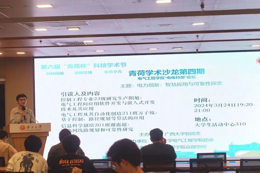 为促进电力领域的创新与发展,推动智慧应用与可靠性探索,增强同学们学以致用的能力及科创兴趣,3月24日晚,由共青团广西大学委员会主办,我院团委和众创空间共同承办的青荷学术沙龙第4期暨第3期“电电科创”论坛在大学生活动中心310会议室举行。我院“四创”教研室执行主任、团委副书记(兼)李勇,辅导员林思维出席论坛,论坛由众创空间主席团成员冯小溪主持。 图1 论坛开始 本次论坛聚焦于电力创新的核心议题,探讨电力领域的最新发展趋势、智慧应用技术以及可靠性探索的前沿动态。与会嘉宾分享他们在电力领域的研究成果和经验,共同探讨当前电力行业面临的挑战和机遇。 23级控制工程专业研究生卢阳旭同学向大家详细介绍电气与自动化向应用软件开发与嵌入式开发技术及其应用,以学院综合测评系统以及电力行业的工程项目为例进行经验分享,激发同学们对该领域的学习兴趣和深入思考,并鼓励在座同学利用课余时间学习相关软件和技术,做好学习以及就业规划。 图2 卢阳旭同学发言 电气工程及其自动化创培211班万子锐同学热情分享了基于自动控制、路径规划等算法的应用,通过红外循迹小车等作品展示以及学科竞赛参赛经验,帮助在座同学加深对所学知识的理解和应用,燃起同学们浓厚的学术热情。 图3 万子锐同学发言 信息科学创培201班谢惠超同学和与会同学深入交流配电网线路规划和可靠性研究方面的知识,分享自己在该领域的研究成果与实践经验,探讨当前配电网存在的问题与挑战,并提出解决方案与展望,帮助同学们拓展学术视野,提升科研思维。 图4 谢惠超同学发言 本次论坛为我院同学踊跃探讨创新想法提供良好的交流平台,为同学们积极参与科创活动提供参考,有助于提升同学们创新创业的积极性。 图5 集体合照