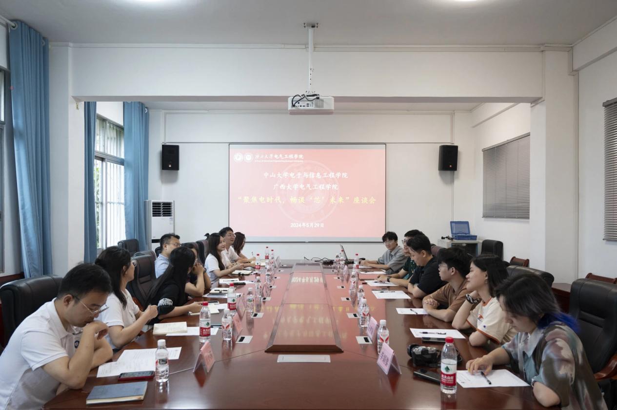 最后,师生们回到广西大学电气工程学院315会议室召开“聚焦电时代,畅谈‘芯’未来”座谈会。会上,两校师生根据自己的工作、学习经历,分享学院在人才培养、科学研究、学生服务等方面的建设成果与经验。此外,师生们也就学院的团学活动开展以及学生组织的管理等问题进行深入讨论。