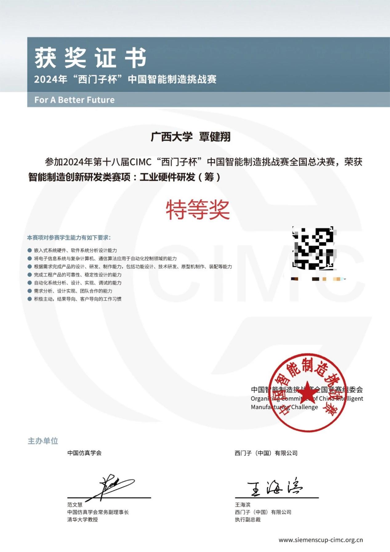 8月11日至15日,2024年CIMC“西门子杯”中国智能制造挑战赛全国总决赛在中国湖州举行,由我院胡立坤教授指导的覃健翔“镰刀和锤头队”,首次在智能制造创新研发类赛项:工业硬件研发(筹)赛项中斩获全国特等奖。本次参赛项目获电气工程学院2024年度“研究生素质能力提升类项目”的资助。覃健翔同学为我院2022级控制工程专业硕士研究生。