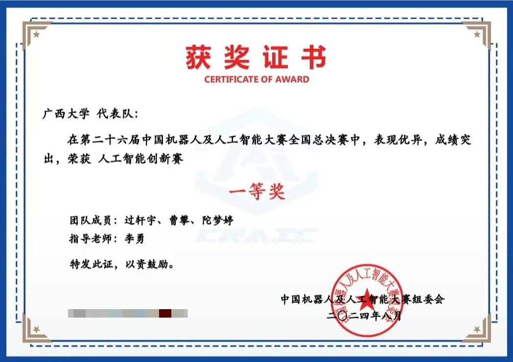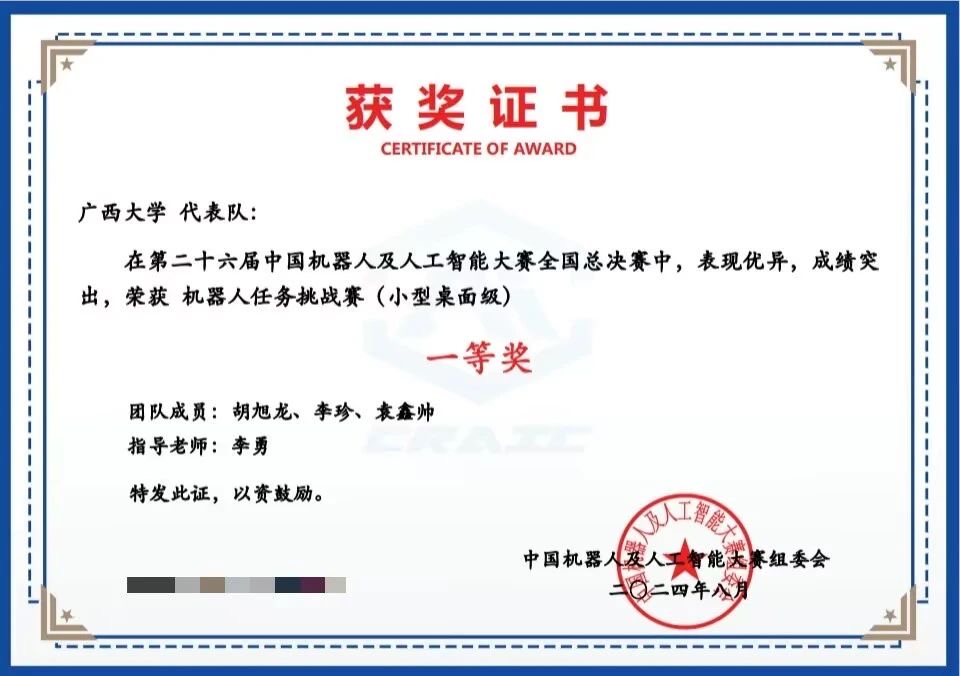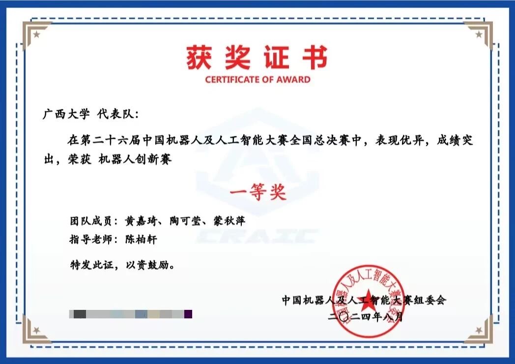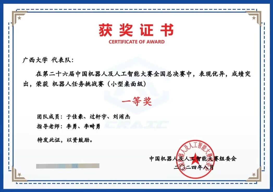 近期,第二十六届中国机器人及人工智能大赛全国总决赛在安徽合肥举行,我校参赛队伍共斩获42项全国奖项。其中,我院获全国一等奖5项、全国二等奖6项、全国三等奖14项、全国优秀奖1项。本次获奖成绩为我院学生历年来在该项赛事上取得的最好成绩。 在该赛事广西区赛中,我校获得一等奖30项、二等奖26项、三等奖17项,并获得广西赛区优秀组织奖。该赛事是我院基于众创空间平台的“新工科”教育重要载体,我校本次比赛的相关工作由我院精心组织。我院众创空间、广西大学ROBOT-Z机器人创新实践基地和广西大学学科竞赛创客空间等为参赛同学提供了丰富多样的培训、经验交流、比赛设备及实验场地等资源,为参赛同学提供了充足的条件。 据悉,中国机器人及人工智能大赛作为中国人工智能学会最早主办的竞赛之一,是一项历史悠久、影响广泛的全国性学科竞赛,旨在培养学生的人工智能及机器人相关专业知识以及实践动手能力,提高学生的创新创业水平,近年来连续列入全国普通高等学校学科竞赛排行榜。本次大赛共有来自清华大学、哈尔滨工业大学、复旦大学、广西大学等近500所高校千余支队伍进入全国总决赛。 我院荣耀