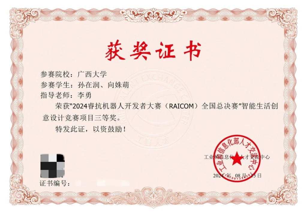 在由工业和信息化部人才交流中心主办的“2024睿抗机器人开发者大赛(RAICOM)全国总决赛”中,我院电创221班张铭宇同学、电自228班唐积琛同学在机器人交互创意设计竞赛项目中荣获全国三等奖;电自228班孙在润同学、自动化231班向姝荫同学则在智能生活创意设计竞赛项目中获得全国三等奖。此外,在该赛事广西赛区总决赛中,我院学生表现优异,获得3项一等奖和1项三等奖。
