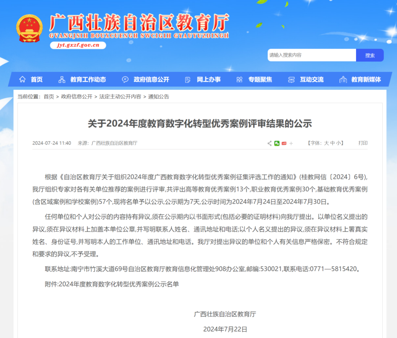 近日,广西壮族自治区教育厅公布了2024年度教育数字化转型优秀案例名单,我院报送的《大学生信息管理与服务数字化平台》入选优秀案例。