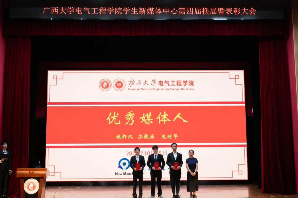 10月15日下午,广西大学电气工程学院学生新媒体中心第四届换届暨表彰大会于大学生活动一楼小剧场顺利举行。团委副书记蒋冬连、李娟,中心指导老师冯敏等老师代表出席会议,新闻与传播学院新媒体中心代表以及各兄弟学生组织代表、电气学院学生新媒体中心全体成员参加会议。