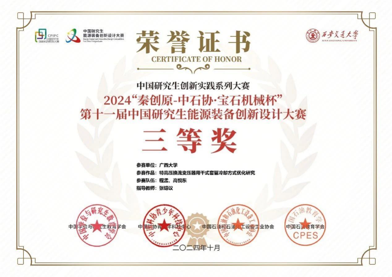 10月18日至20日,“秦创原—中石协·宝石机械杯”第十一届中国研究生能源装备创新设计大赛决赛在西安交通大学举行,在张镱议老师的指导下和“2024研究生素质能力提升项目资助”下,我院电气工程研225班程孟、电气工程研231班高悦东参赛的“特高压换流变压器用干式套管冷却方式优化研究”项目获得全国三等奖