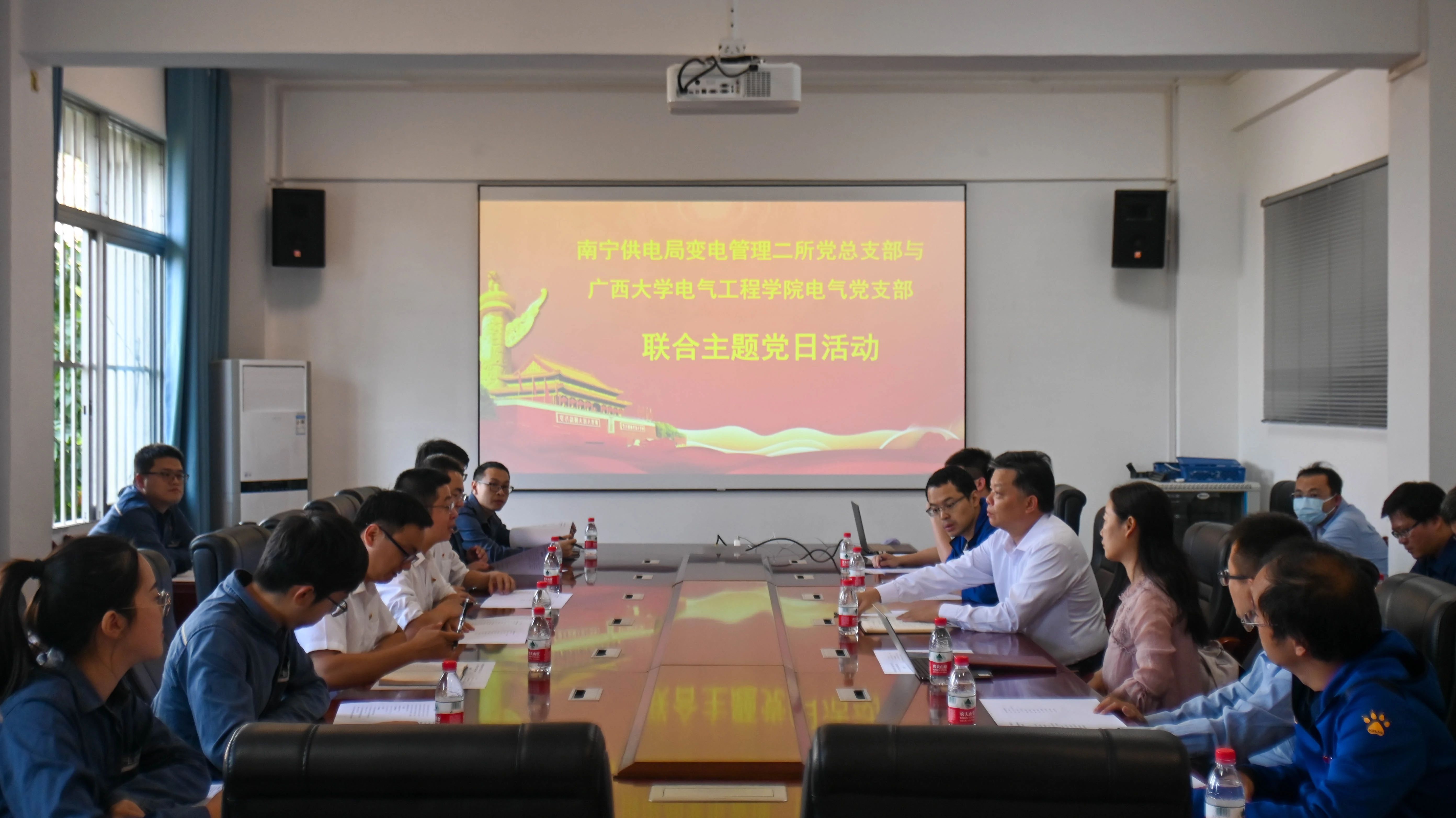 为深入学习贯彻习近平新时代中国特色社会主义思想,聚焦高质量党建引领高质量发展,切实推动党建与业务深度融合发展,10月29日下午,我院电气党支部(以下简称“电气党支部”)与南宁供电局变电管理二所(以下简称“变电二所”)党总支部在学院315室联合开展“支部协同引发展,科研合作展风貌”主题党日活动。我院党委书记梁志坚,电气工程系主任兼电气党支部书记陈碧云,变电二所经理兼党总支部书记于树海,变电二所副经理苏颜、杜珂出席,电气党支部和变电二所党员共二十余人参加。