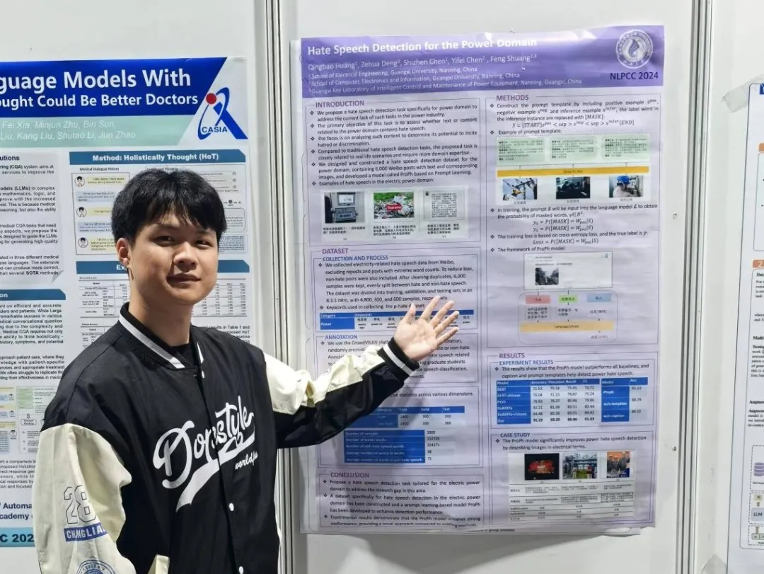 据悉,本届大会共收到461篇投稿,其中40篇接收为口头报告,121篇被录取为海报(poster)。大会特别设立了海报交流环节,邀请了自然语言处理领域国际顶级期刊和会议论文作者与参会代表进行了现场交流。邓泽华参会论文《Hate Speech Detection for the Power Domain》获得海报展示,该论文提出了一个能源领域的讽刺数据集,为隐喻检测领域探索了一个新的方向。