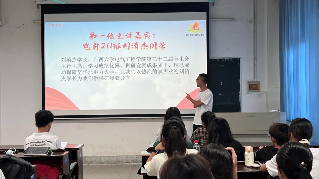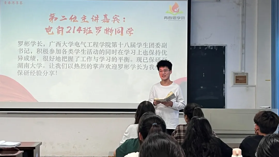 为深入学习宣传贯彻党的教育方针,积极响应习近平总书记关于青年成长成才的重要论述,帮助广大青年学子全面理解保研、考研的实践路径,明确个人职业规划,激发内在潜能与斗志,11月19日,我院在学院304教室开展“青春启航:保研之路的经验之光”主题青春思享荟活动。本次活动由共青团广西大学委员会主办,共青团广西大学电气工程学院委员会承办,院学生会策划开展,学院团委、学生会骨干参加活动。 01 第一位青春宣讲人-刘洧杰 刘洧杰,广西大学电气工程学院第二十二届学生会执行主席,学习成绩优异,科研竞赛成果丰富,现已成功保研至华北电力大学。刘洧杰同学分享了从考研备考到保研成功的过程,强调了保研之路中“硬实力”与“软实力”并重的关键性。他提到,在致力于提高学业成绩、巩固学术基础、追求竞赛获奖以及高分通过六级英语考试这些“硬实力”的同时,也应充分利用在学生组织中的工作经验这一“软实力”,以全方位提升个人的综合竞争力。 刘洧杰同学 02 第二位青春宣讲人-罗彬 罗彬,广西大学电气工程学院第十八届学生团委副书记,成绩优异,积极参与学生活动,有效平衡工作与学习,现已保研至湖南大学。罗彬同学着重阐述了参加夏令营与预推免的关键作用,强调了维持优异成绩的必要性,同时提供了选择导师与学校的宝贵建议。他指出,保研过程中需平衡学业与课外活动,积极筹备面试,并明智地挑选目标院校与导师。罗彬还鼓励道,保研之路并非一帆风顺,要以平常心面对,只要持之以恒,终将渡过难关。 罗彬同学 此次活动,是学院推动学风建设而采取的行动,为青年学子搭建了一个信息交流、经验传递的平台,助力低年级同学们在学术深造与未来规划的道路上迈出更加坚实的一步。