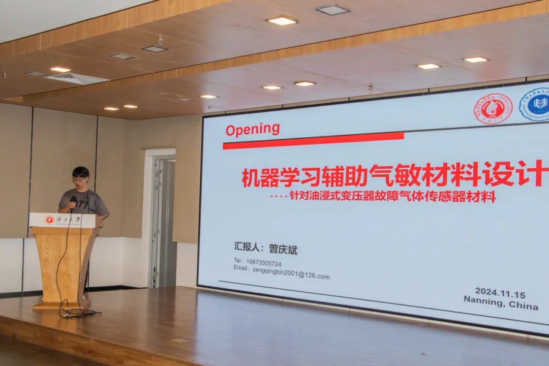 控制工程233班的曾庆斌同学介绍了机器学习在气敏材料设计领域的应用。针对油浸式变压器故障气体的气敏材料的设计问题,他们团队使用机器学习方法进行辅助,以重金属二硫化物材料作为研究对象,通过10种机器学习模型进行训练,筛选出3个效果最佳的模型,成功预测和筛选出符合要求的新材料,并且在分析过程中引入了新的变量,为传感器材料的开发提供了新思路。