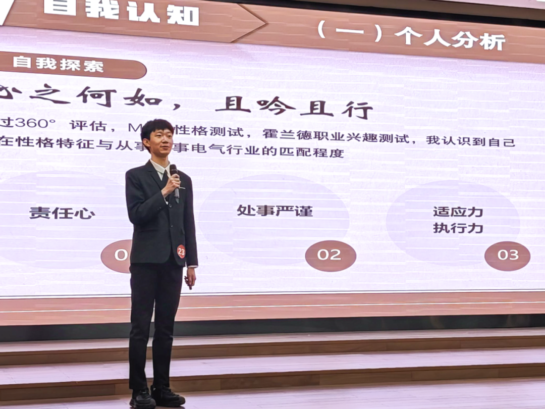 决赛舞台上,我院选手围绕自我认知、职业探索、目标规划、实践积累、反思提升等要点,结合鲜活案例,深入剖析个人职业路径,生动展现出青春力量融入强国征程的担当与豪情,诠释着对职业规划的深刻洞察。答辩环节,选手们面对评委的提问,从容应对,阐述创新职业理念与可行方案,分享逐梦路上的拼搏点滴,赢得评委和观众的肯定。