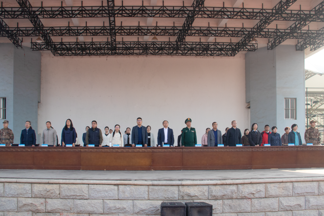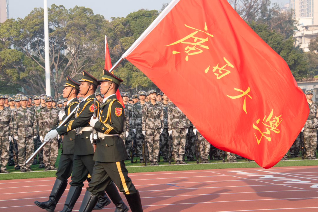 红旗冉升,奏唱国歌。军训汇演拉开帷幕