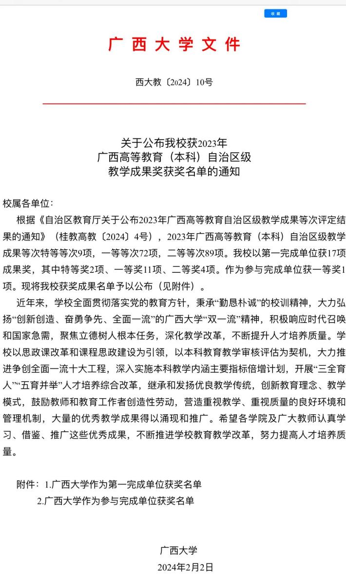 我院喜获三项2023年广西高等教育(本科)自治区级教学成果奖刘辉副院长、黎静华教授的主持项目均获得一等奖,胡立坤教授主持项目获得二等奖。