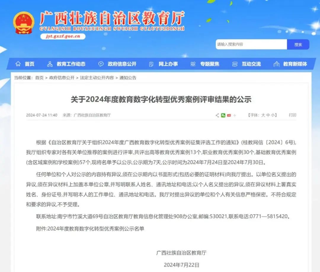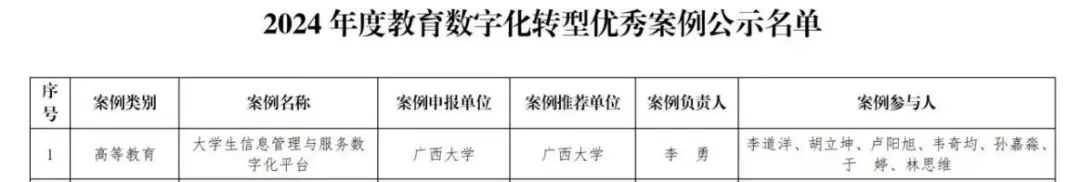 我院的《大学生信息管理与服务数字化平台》入选广西壮族自治区教育厅公布的2024年度教育数字化转型优秀案例名单优秀案例