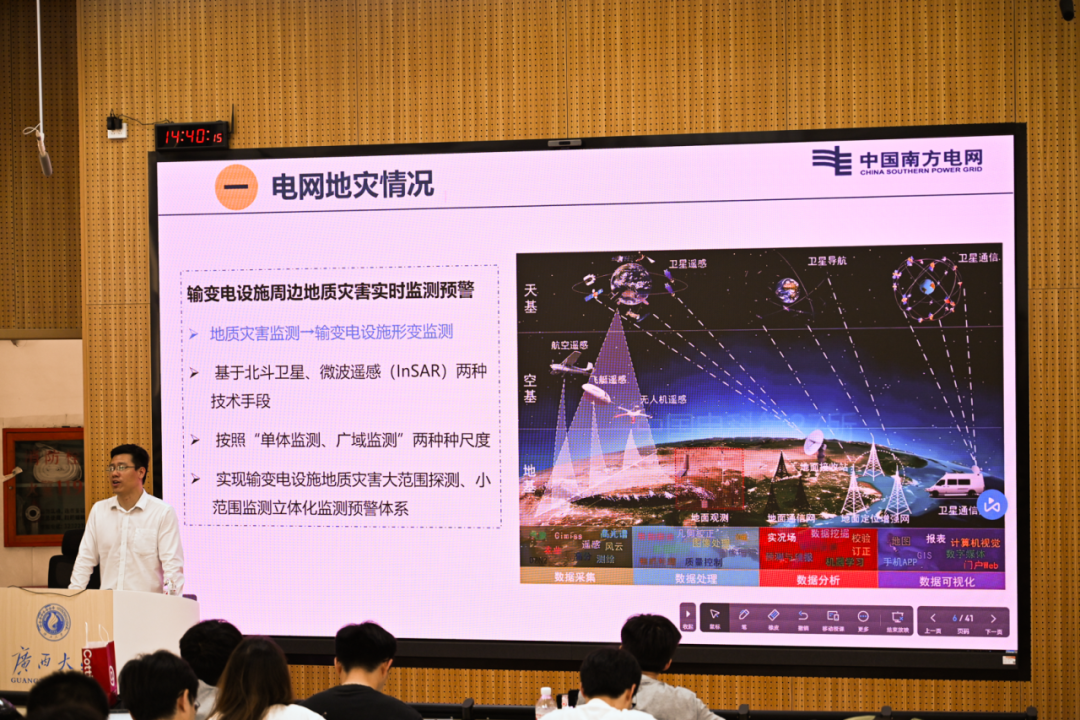 为提升我院学生工程应用与实践能力,了解当下科研工作前沿,助力其成长成才,3月28日下午,我院在东10A-305教室举行第7期“行业大咖进课堂”暨电气工程学科前沿讲座。广西电网公司电力科学研究院教授级高工黄志都受邀到我院为师生们作题为“电网地质灾害监测预警技术”的讲座,我院2024级电气工程专业全体博士、硕士及部分本科生共250余人参与讲座。 黄志都高工正在授课 讲座伊始,黄志都高工从电网输电通道周边地质灾害情况切入,迅速吸引了同学们的注意力。随后,他讲述了基于北斗卫星和微波遥感(InSAR)两种技术手段的应用方法,此方法能同时按照“单体监测、广域监测”两种尺度实现输变电设施地质灾害大范围探测、小范围监测立体化监测预警体系,并能够实现三维可视化展示。 黄志都高工介绍电网地灾情况 其中,InSAR遥感监测技术的特点在于设计了输变电设施地质灾害监测系统的架构,包括北斗实时单体监测、遥感InSAR局域监测和输电杆塔三维可视化这三大基本模块。黄志都高工结合广西电网历史地质灾害情况,向同学们深入讲解了InSAR遥感监测的具体应用案例,并清晰地展现了InSAR遥感监测手段能够针对每个遥感点生成不同颜色的标识,以及相关地形变化数据和曲线。 同学们认真听课与做笔记 此次讲座不仅拓宽了同学们的学术视野,激发了同学们对前沿技术的浓厚兴趣和深入探索的动力。同时,黄志都高工关于实践经验与行业洞察的分享,也为同学们未来的职业规划提供了宝贵的指导和启发。未来,学院将继续开展“行业大咖进课堂”系列活动,通过持续深化校企合作课程体系建设,推动产学研协同发展,共同打造科技创新与高素质人才培养的双赢格局。