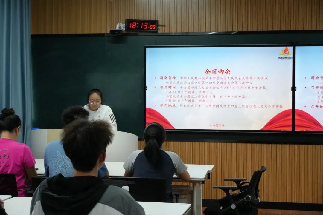 我院团委高度重视青年理论学习,将理论学习融入到日常教育中。会议开始,主持人王刘位同学作为活动策划人首先向同学们介绍了2025年全国两会的丰富内涵和深远意义。