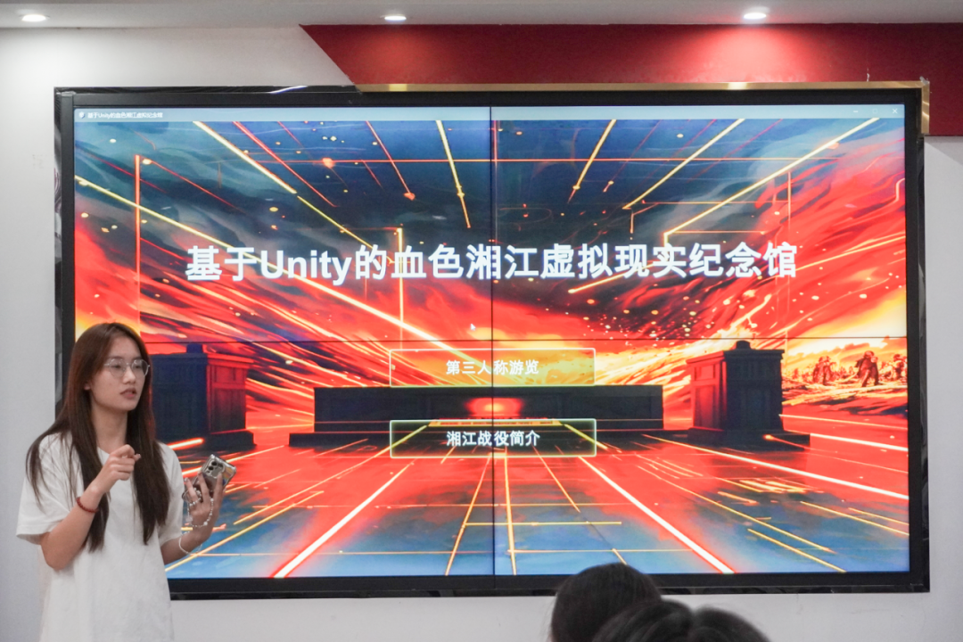 随后,参与者们移步至马克思主义学院5楼开展红色战役知识竞答,并参观了我院众创空间研发的基于Unity的湘江战役虚拟现实纪念馆。该纪念馆集成了红色文化历史文物画作的虚拟展览,AI数字人历史知识语音问答,3d还原历史文物观看,第三人称纪念漫游观展,相关知识答题系统等多项功能