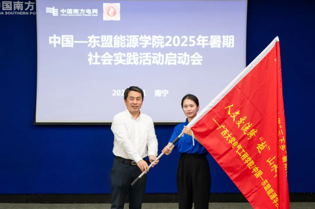 活动首站,实践团来到广西电网有限责任公司,举行了授旗仪式,正式启动中国—东盟能源学院成立后的首期社会实践活动。