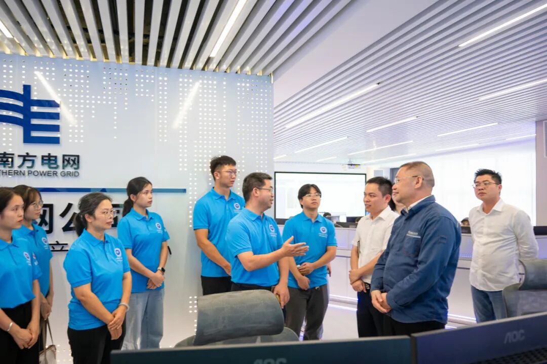 启动会后,实践团探访了广西电网电力科学研究院数智空间。在工作人员引导下,成员们近距离接触了电力系统的智能化与数字化成果,从实时调度系统到设备数字孪生,从电动汽车无线充电到电力杆塔无线供电,同学们对电力科技的创新发展有了更直观、深刻的理解。