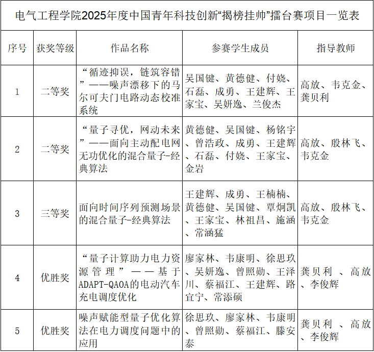 2025年度中国青年科技创新“揭榜挂帅”擂台赛新一代信息技术领域主擂台赛终审于10月26日至28日在西部科学城重庆高新区举行。经过激烈角逐,我院参赛团队发挥出色,最终荣获二等奖2项、三等奖1项、优胜奖2项,充分展现了我院青年学子扎实的专业功底和活跃的科技创新实力。 一直以来,学院高度重视学生科技创新能力培养,始终坚持以赛促学、以赛促创的理念。依托学科特色和专业优势,积极搭建科研训练平台,整合校内外优质资源,为参赛团队提供专业指导。从电气工程领域相关项目的选题孵化、多学科交叉团队的组建,到赛前系统的技术培训与模拟演练,学院在电力系统、新能源技术、智能控制等方向给予全方位支持,为学生的科研探索与创新实践提供坚实保障。 本次参赛项目均聚焦量子科技核心领域,围绕量子计算技术攻关与场景应用展开,对接国家“十五五”规划重点产业布局。量子科技是国家“十五五”核心发展方向,我院拥有扎实的研究积淀,并依托前沿量子技术突破形成创新势能;在竞赛培育中,我院统筹资源、强化专业指导,力争持续产出高水平竞赛成果。 项目介绍 本届赛事由共青团中央联合中国科协等五部委共同主办,共青团重庆市委和重庆高新区管委会承办,以“企业出题、青年破题”为机制,聚焦芯片设计、量子算法、空天互联等关键领域,精准发布21项技术难题,推动产学研深度融合的创新闭环。该擂台赛不仅为青年科技人才提供了展示创新能力的国家级平台,更有力推动了区域产业升级与新质生产力培育,为加快建成具有全国影响力的科技创新中心注入青春动能。 据悉,此次赛事共吸引全国378所高校的1200余支团队及50余支青年科技人才团队报名。经初审,500余支优秀团队晋级终审。终审将评选出多名“擂主”,发榜单位不仅提供总额逾500万元的奖金池,还将为优胜方案提供产业化对接机会,切实推动科技成果转化。 未来,学院将继续深化与电力企业、能源集团的产学研合作,不断丰富学生在电气工程领域的实战经验,孵化更多技术领先、应用性强的高水平项目,全面提升学生的创新创业能力,努力培养更多适应行业发展需求、具备创新精神和实践能力的高素质人才。 参赛选手合影