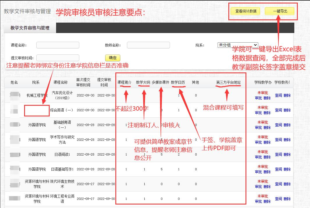 答:上传的教学大纲不用手签签名,在相应位置写明制订人、审核人信息即可。教学日历需要手写签名、盖学院章,上传PDF扫描件。教学材料由基层教学组织负责人负责审核具体内容,教学副院长总负责,网络审核人员负责查看上传文件的完整性及是否有相应签字盖章。